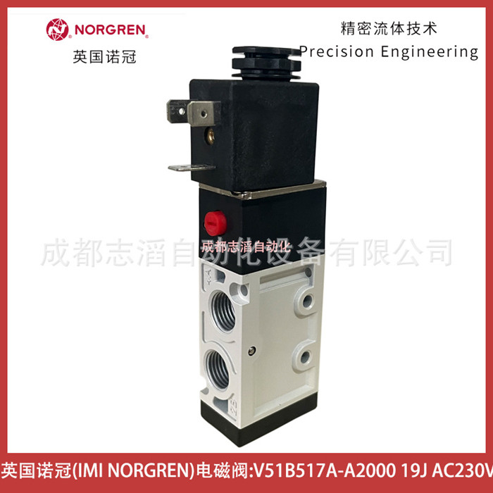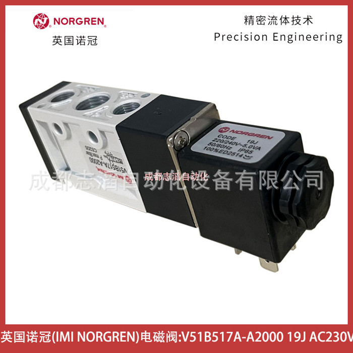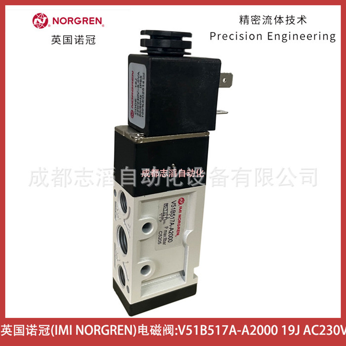 V51B517A-A2000线圈电压AC230V型号19J英国诺冠IMI NORGREN电磁阀技术参数简介:功能2位5通、接口G1/4、排气孔G1/8、驱动方式电控/弹簧复位、工作压力2-8bar、流量1020升/分钟、手动功能按下旋转锁定、阀体重量0.184kg、线圈电压AC230V、功耗6/5伏安、防护等级IP65、22MM工业线圈、环境温度-5到60摄氏度、流体温度-5到50摄氏度、介质压缩空气、现货、产地中国
