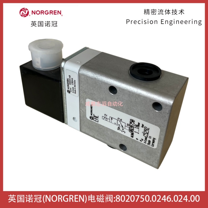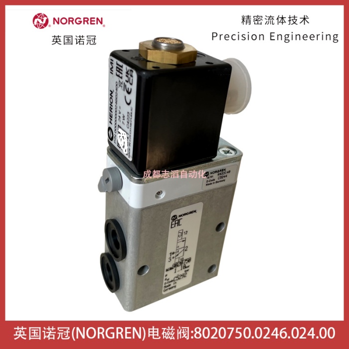 8020750.0246.024.00英国诺冠NORGREN电磁阀-埃迈海隆HERION技术参数:接口尺寸G1/4、工作压力1-10bar、流量1200l/min、响应时间35ms、阀体重量0.4kg、配海隆普通线圈0246(功率为3W、防护等级IP65、环境及流体温度范围-25到80摄氏度、电气连接为175301-803A型)、线圈电压为24V直流、阀体产地为德国、线圈产地为捷克!