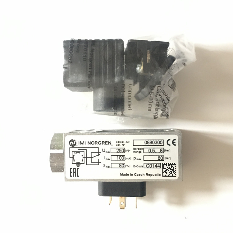 0880300英国诺冠(IMI norgren)压力开关技术参数:接口尺寸G1/4、工作压力0.5-8bar、密封为NBR、主用应用在电厂行业、木工机械行业、水泥生产等!、技术优势说明:镀金触头、长寿命;抗震15g、符合UL和CSA规范微动开关;可直接与Excelon空气处理单元连接;本安型运行!