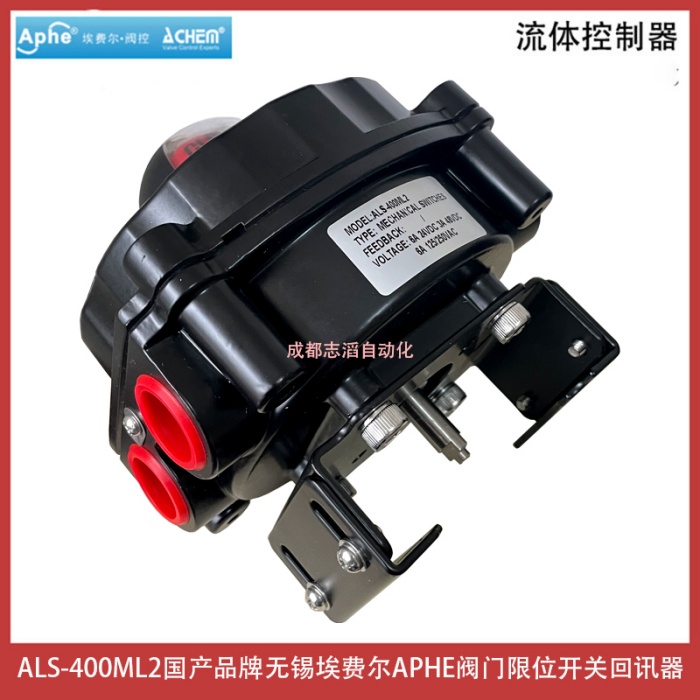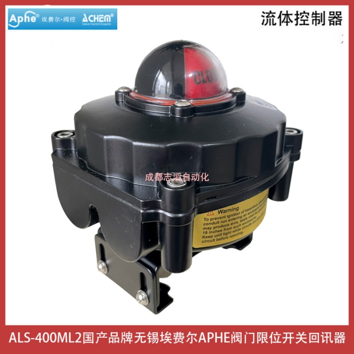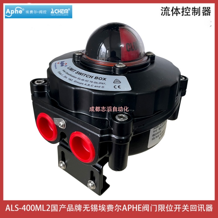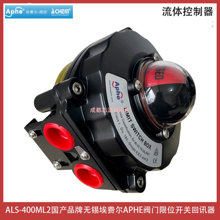 ALS-400ML2国产品牌无锡埃费尔APHE阀门限位开关回讯器产品功能简介:三维位置指示器能够清楚的显示阀门所处的位置、压铸铝合金壳体,粉末涂层,紧凑设计外型美观,减少阀门包装体积,质量可靠、双线接口 双1/2 NPT管接口、信号反馈器、开关位置可由指示器清楚辨识、多接点内接线路板 内部8个触点接线板符合微型开关的标准,DPDT开关可选、接近开关、磁性开关可选并可用于电磁阀的连接、“快速位置”凸轮; ITS-100限位开关的可调节凸轮通过花键和弹簧安装;开关凸轮的位置不用工具即可进行快速调整、用PCB板代替接线,防止短路、环境温度:-25~85℃,防护等级:IP67,可选IP68,防爆等级:ExdII BT6、Eexd IICT6,符合EN50014/50018标准、双接线口,标准接点,接线安全、方便ALS系列阀门限位开关是自动化控制系统中检测阀门状态的现场仪器,用以将阀门开启或者关闭位置以开关量信号输出,以被程控器接收或计算机寻访采样,确定后执行下一步程序,该产品也可以作为自控系统中重要的阀门连锁保护及远程报警指示之用,产品获得众多阀门客户的认可