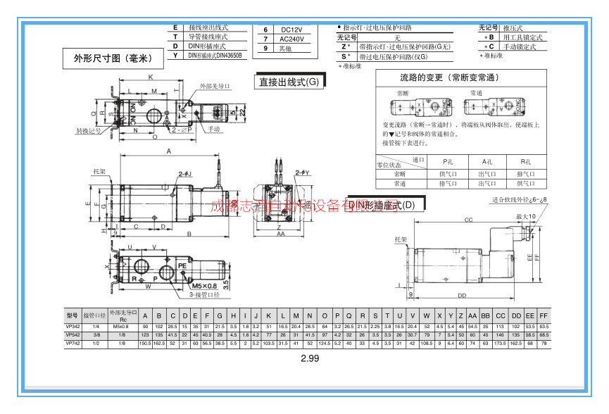 VP742-5DZD1-04A日本SMC电磁阀3通先导式技术参数简介:使用流体空气、机能常通或者常断通用、先导方式内部先导式/外部先导式、使用压力范围0.2-0.8兆帕(主路压力101KPA-0.8外部先导压力与主路压力相同,zui低0.2)、环境及流体温度负10到正50摄氏度(未结冰)、响应时间30毫米以下、zui好动作频率5次每秒、给油不需要、抗冲击振动能力300/50m/ss、阀体大小1/2基准、阀体形式直接配管型、额定电压直流24伏、导线引出方式DIN型插座式、带指示灯以及过电压保护、接管口径1/2、零位状态NC、产地日本